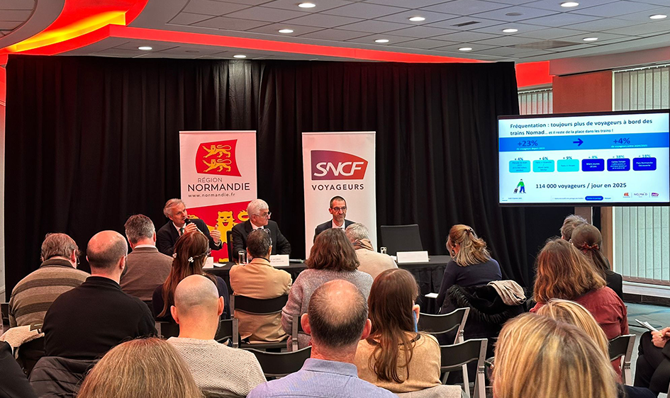 Hervé MORIN, Président de la Région Normandie, Jean-Baptiste GASTINNE, Vice-président en charge des transports et de la mobilité, et Grégoire FORGEOT D’ARC, Directeur Régional Lignes Normandes SNCF Voyageurs, ont présenté le bilan 2025 de l’activité ferroviaire des lignes normandes et les perspectives pour l’année 2026.