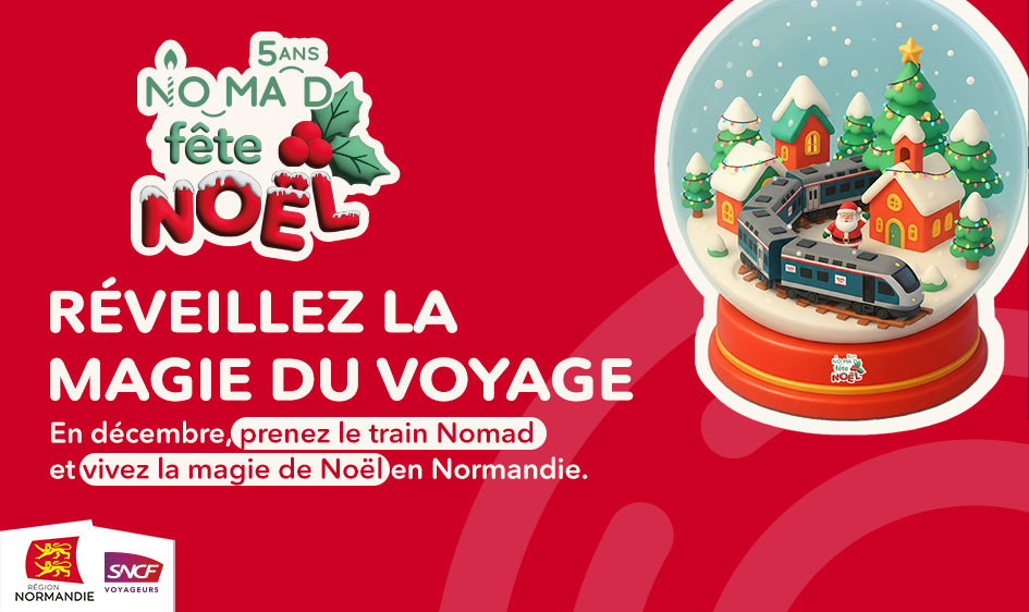Pour célébrer les fêtes et clôturer l’anniversaire des 5 ans du réseau NOMAD, la Région Normandie et SNCF Voyageurs proposent des offres et des animations tout au long du mois de décembre.