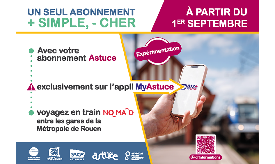 Afin de faciliter et de développer la multimodalité, la Région Normandie, la Métropole Rouen Normandie et le Syndicat mixte Atoumod ont décidé de mettre en place un dispositif expérimental permettant de voyager sans surcoût avec des titres urbains Astuce sur le réseau NOMAD Train à compter du 1er septembre 2024.